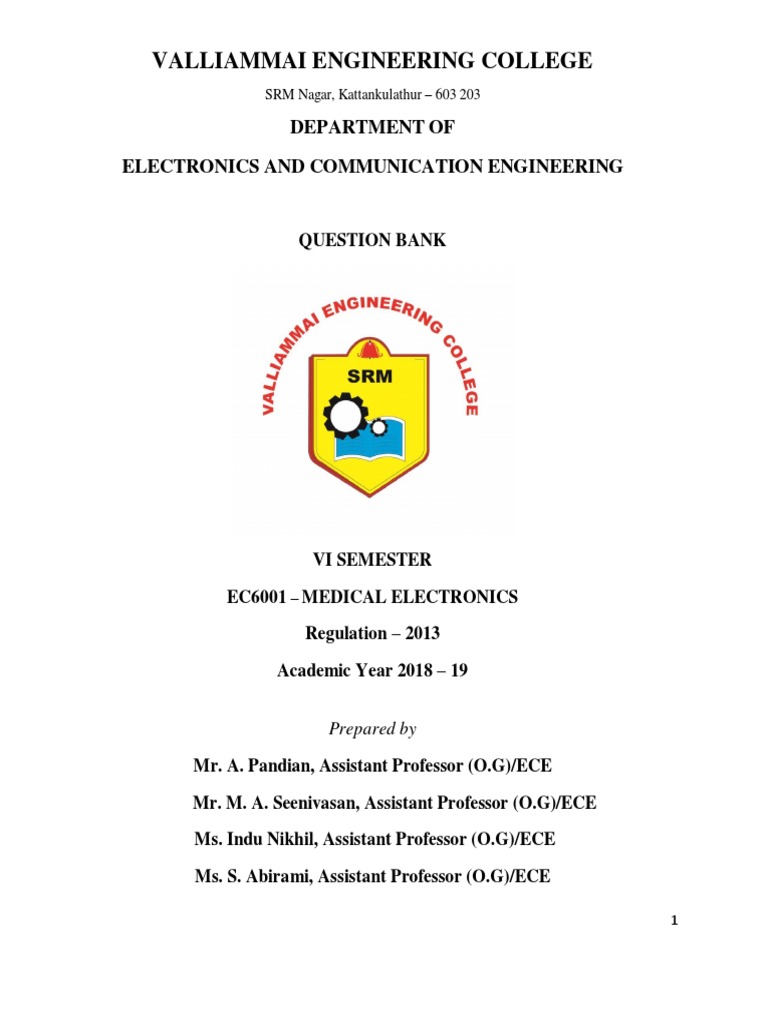 Medical Electronics Ec6001 Anna University Lecture Notes Study Material Important Questions Answers Question Paper