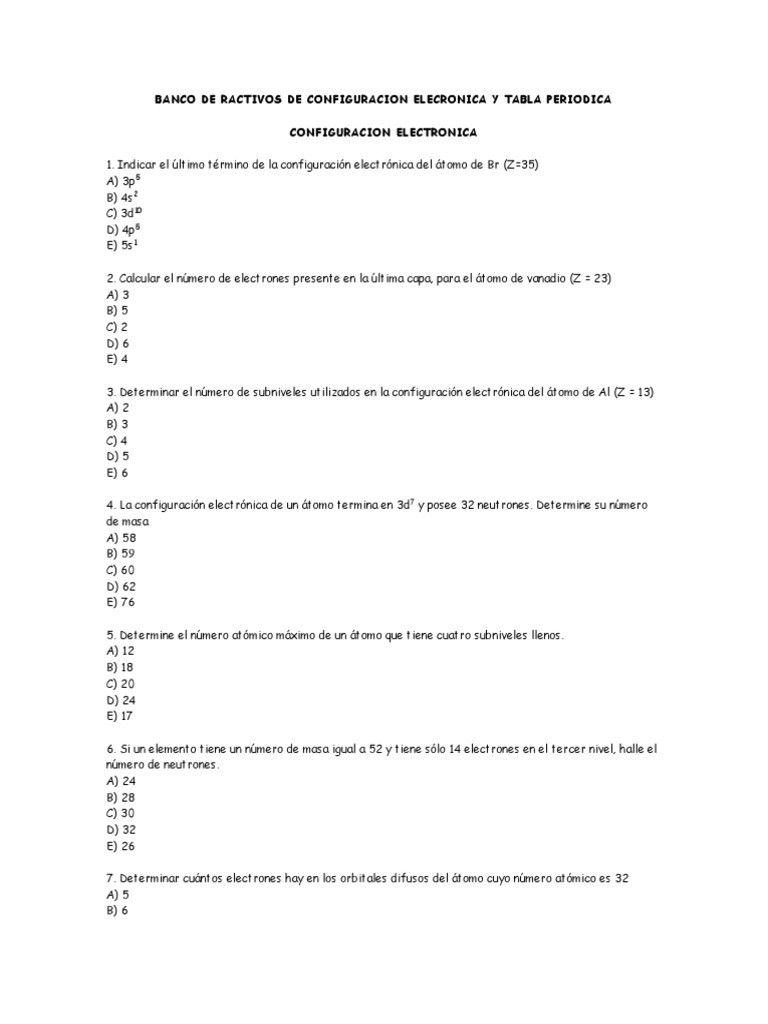 Banco De Ractivos De Configuracion Elecronica Y Tabla Periodica Configuracion Electronica Tabla Periodica